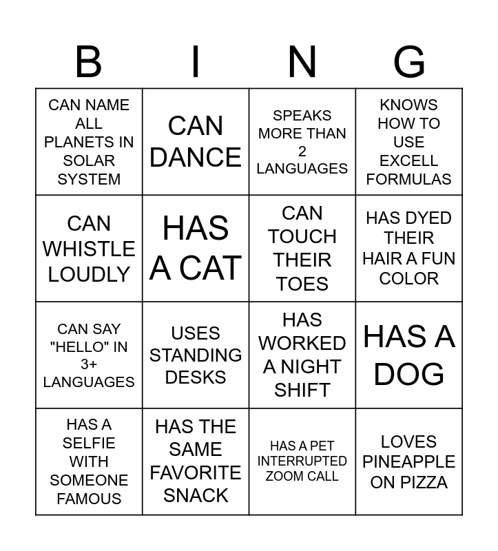 This bingo card has 20 words: HAS A DOG, HAS BIRTHDAY IN THE SAME SEASON, SPEAKS MORE THAN 2 LANGUAGES, HAS A HIDDEN TALENT, HAS A SELFIE WITH SOMEONE FAMOUS, CAN WHISTLE LOUDLY, HAS THE SAME FAVORITE SNACK, CAN NAME ALL PLANETS IN SOLAR SYSTEM, CAN SAY "HELLO" IN 3+ LANGUAGES, CAN DANCE, USES STANDING DESKS, HAS WORKED A NIGHT SHIFT, HAS A CAT, LOVES PINEAPPLE ON PIZZA, CAN TOUCH THEIR TOES, CAN SOLVE A RUBIK'S CUBE, HAS DYED THEIR HAIR A FUN COLOR, KNOWS HOW TO USE EXCELL FORMULAS, HAS A PET INTERRUPTED ZOOM CALL and HAS ACCIDENTALLY HIT "REPLY ALL".