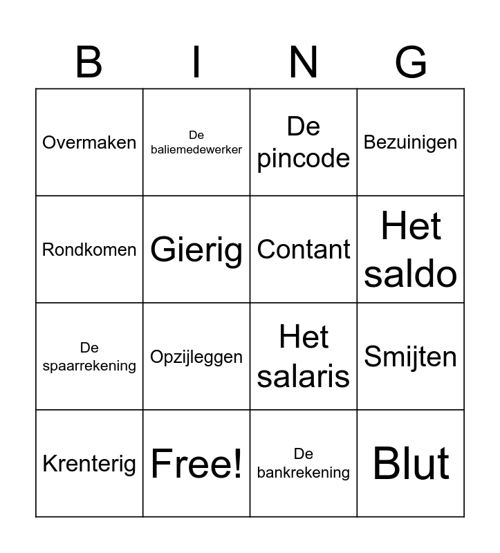 This bingo card has 21 words: Free!, De balie, De baliemedewerker, Het bankbiljet, De bankrekening, Contant, Overmaken, De pincode, Het salaris, Het saldo, De spaarrekening, Bezuinigen, Blut, Het budget, Gierig, De knip, Krenterig, Opzijleggen, Rondkomen, Smijten and Vrijgevig.