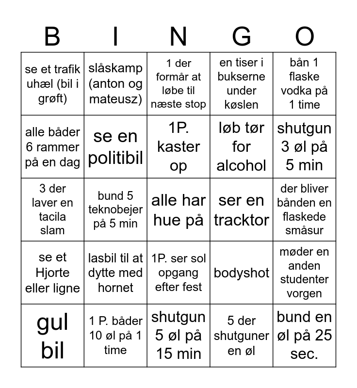 This bingo card has a free space and 24 words: lasbil til at dytte med hornet, 1 P. båder 10 øl på 1 time, 1P. kaster op, gul bil, bån 1 flaske vodka på 1 time, se et trafik uhæl (bil i grøft), alle båder 6 rammer på en dag, slåskamp (anton og mateusz), ser en tracktor, 1P. ser sol opgang efter fest, løb tør for alcohol, 3 der laver en tacila slam, bodyshot, møder en anden studenter vorgen, se en politibil, 5 der shutguner en øl, der bliver bånden en flaskede småsur, 1 der formår at løbe til næste stop, shutgun 3 øl på 5 min, bund 5 teknobejer på 5 min, bund en øl på 25 sec., se et Hjorte eller ligne, en tiser i bukserne under køslen and shutgun 5 øl på 15 min.