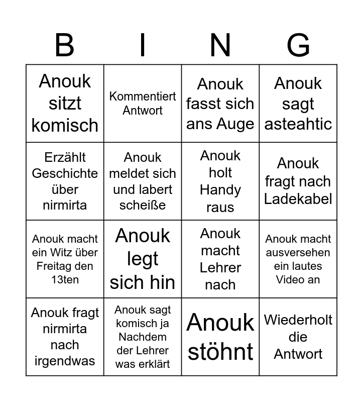 This bingo card has 16 words: Anouk sagt komisch ja Nachdem der Lehrer was erklärt, Anouk macht ausversehen ein lautes Video an, Anouk fasst sich ans Auge, Anouk sitzt komisch, Anouk macht ein Witz über Freitag den 13ten, Kommentiert Antwort, Anouk macht Lehrer nach, Anouk stöhnt, Erzählt Geschichte über nirmirta, Anouk meldet sich und labert scheiße, Anouk fragt nirmirta nach irgendwas, Anouk sagt asteahtic, Anouk legt sich hin, Anouk fragt nach Ladekabel, Anouk holt Handy raus and Wiederholt die Antwort.