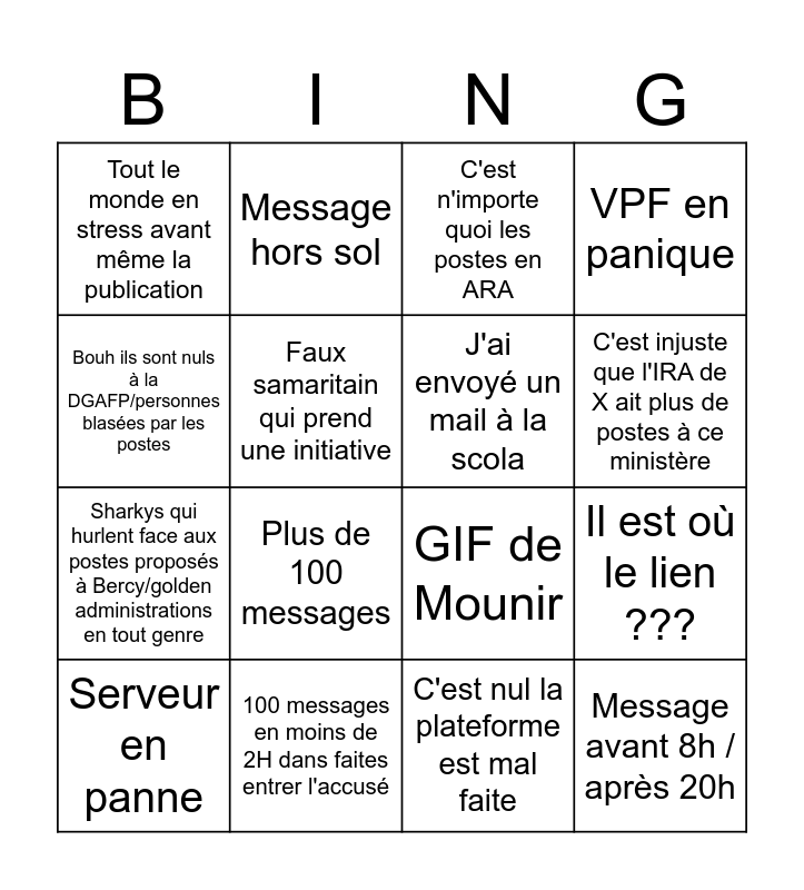 This bingo card has 16 words: 100 messages en moins de 2H dans faites entrer l'accusé, Il est où le lien ???, C'est n'importe quoi les postes en ARA, Tout le monde en stress avant même la publication, Sharkys qui hurlent face aux postes proposés à Bercy/golden administrations en tout genre, Message hors sol, GIF de Mounir, C'est nul la plateforme est mal faite, Bouh ils sont nuls à la DGAFP/personnes blasées par les postes, Faux samaritain qui prend une initiative, Serveur en panne, VPF en panique, Plus de 100 messages, C'est injuste que l'IRA de X ait plus de postes à ce ministère, J'ai envoyé un mail à la scola and Message avant 8h / après 20h.