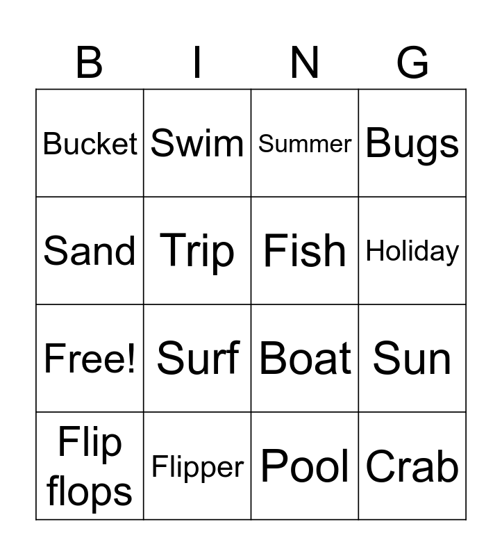 This bingo card has 20 words: Sun, Hot, Summer, Beach, Flip flops, Sand, Flipper, Bucket, Free!, Swim, Surf, Boat, Trip, Crab, Fish, Lemonade, Holiday, Bugs, Pool and Camp.