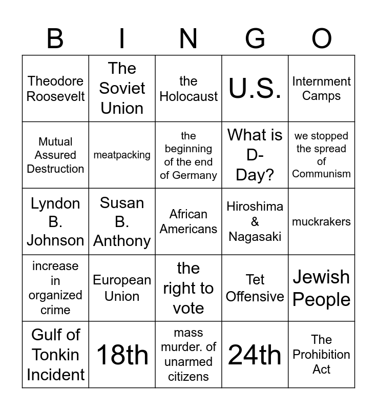 This bingo card has 25 words: European Union, mass murder. of unarmed citizens, the beginning of the end of Germany, Gulf of Tonkin Incident, Internment Camps, Theodore Roosevelt, Mutual Assured Destruction, The Soviet Union, Hiroshima & Nagasaki, the right to vote, What is D-Day?, Lyndon B. Johnson, Tet Offensive, Jewish People, meatpacking, The Prohibition Act, muckrakers, the Holocaust, we stopped the spread of Communism, Susan B. Anthony, African Americans, 18th, increase in organized crime, U.S. and 24th.