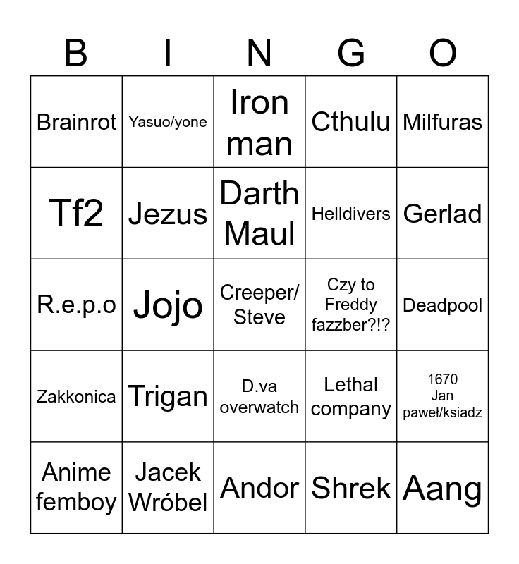This bingo card has a free space and 24 words: Trigan, Jacek Wróbel, Darth Maul, Anime femboy, Milfuras, Brainrot, Tf2, Yasuo/yone, Czy to Freddy fazzber?!?, D.va overwatch, Helldivers, R.e.p.o, Lethal company, 1670 Jan paweł/ksiadz, Jezus, Shrek, Deadpool, Iron man, Gerlad, Jojo, Aang, Zakkonica, Cthulu and Andor.