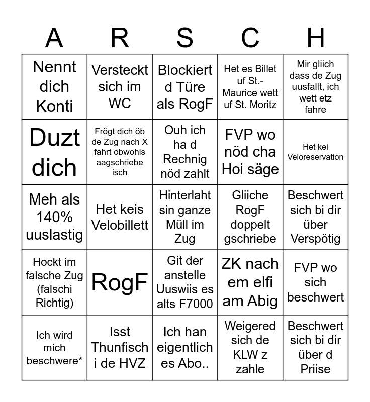This bingo card has 25 words: RogF, Ich han eigentlich es Abo.., Ouh ich ha d Rechnig nöd zahlt, Ich wird mich beschwere*, Mir gliich dass de Zug uusfallt, ich wett etz fahre, Nennt dich Konti, Duzt dich, Versteckt sich im WC, Gliiche RogF doppelt gschriebe, Git der anstelle Uuswiis es alts F7000, FVP wo nöd cha Hoi säge, Meh als 140% uuslastig, ZK nach em elfi am Abig, FVP wo sich beschwert, Frögt dich öb de Zug nach X fahrt obwohls aagschriebe isch, Beschwert sich bi dir über d Priise, Beschwert sich bi dir über Verspötig, Blockiert d Türe als RogF, Het kei Veloreservation, Het keis Velobillett, Hinterlaht sin ganze Müll im Zug, Isst Thunfisch i de HVZ, Hockt im falsche Zug (falschi Richtig), Het es Billet uf St.-Maurice wett uf St. Moritz and Weigered sich de KLW z zahle.