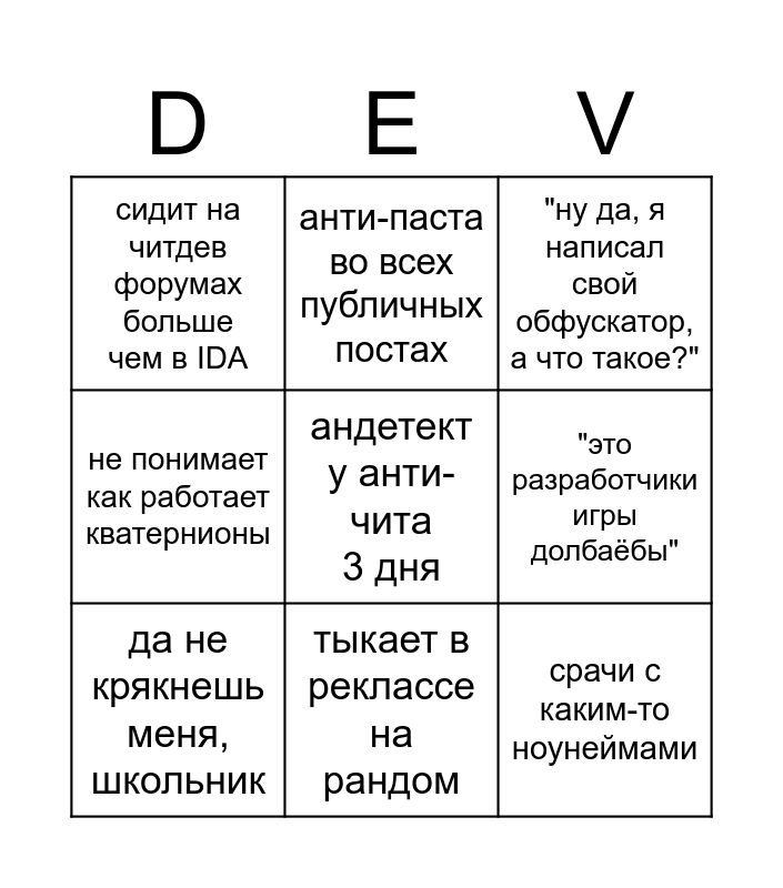 This bingo card has a free space and 8 words: "это разработчики игры долбаёбы", "ну да, я написал свой обфускатор, а что такое?", анти-паста во всех публичных постах, да не крякнешь меня, школьник, сидит на читдев форумах больше чем в IDA, срачи с каким-то ноунеймами, не понимает как работает кватернионы and тыкает в реклассе на рандом.