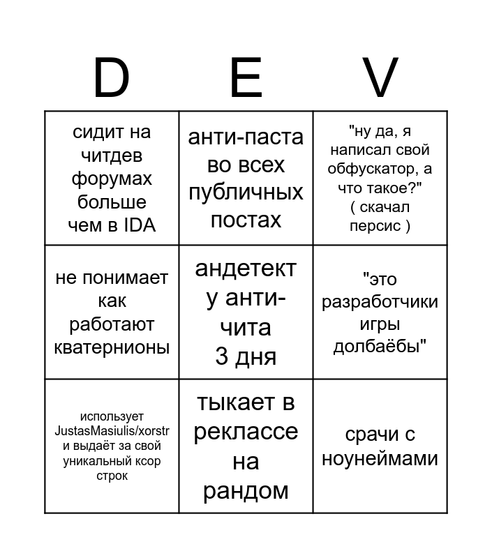 This bingo card has a free space and 8 words: "это разработчики игры долбаёбы", "ну да, я написал свой обфускатор, а что такое?" ( скачал персис ), анти-паста во всех публичных постах, использует JustasMasiulis/xorstr и выдаёт за свой уникальный ксор строк, сидит на читдев форумах больше чем в IDA, срачи с ноунеймами, не понимает как работают кватернионы and тыкает в реклассе на рандом.