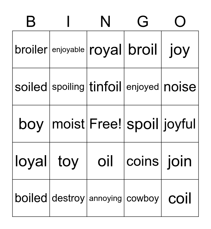 This bingo card has a free space and 24 words: toy, destroy, tinfoil, boiled, joy, broiler, soiled, enjoyable, spoil, oil, enjoyed, boy, coins, join, spoiling, cowboy, joyful, royal, noise, moist, coil, loyal, broil and annoying.