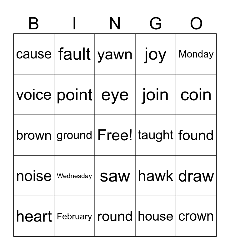 This bingo card has a free space and 24 words: Wednesday, February, eye, heart, Monday, cause, voice, fault, taught, saw, join, brown, hawk, draw, point, house, found, yawn, coin, ground, crown, noise, joy and round.
