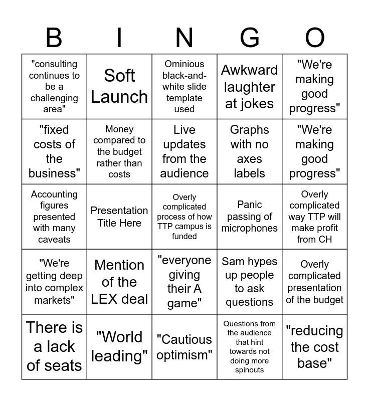 This bingo card has 25 words: Mention of the LEX deal, "Cautious optimism", Live updates from the audience, There is a lack of seats, "We're making good progress", "consulting continues to be a challenging area", "fixed costs of the business", Soft Launch, Panic passing of microphones, "everyone giving their A game", Graphs with no axes labels, Accounting figures presented with many caveats, Sam hypes up people to ask questions, Overly complicated presentation of the budget, Money compared to the budget rather than costs, "reducing the cost base", Overly complicated way TTP will make profit from CH, Ominious black-and-white slide template used, "We're making good progress", Presentation Title Here, Overly complicated process of how TTP campus is funded, "World leading", "We're getting deep into complex markets", Awkward laughter at jokes and Questions from the audience that hint towards not doing more spinouts.