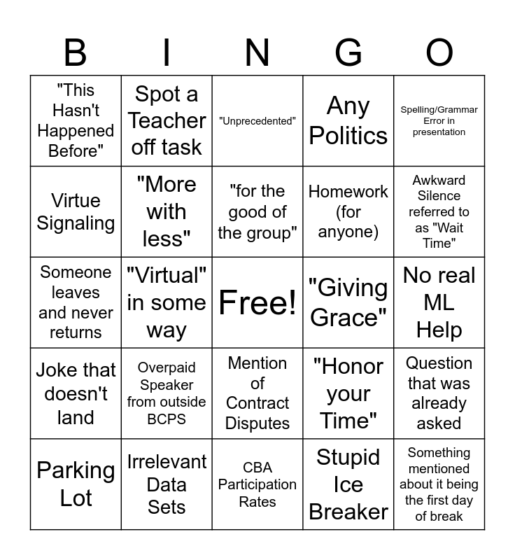 This bingo card has a free space and 29 words: Parking Lot, Must Join New Group, "Virtual" in some way, Tech Issue, "This Hasn't Happened Before", "Unprecedented", "More with less", Overpaid Speaker from outside BCPS, "Giving Grace", Irrelevant Data Sets, No real ML Help, Something mentioned about it being the first day of break, CBA Participation Rates, Stupid Ice Breaker, Awkward Silence referred to as "Wait Time", Curriculum Changes, Mention of Contract Disputes, Joke that doesn't land, Spelling/Grammar Error in presentation, Someone leaves and never returns, "Honor your Time", SPP mention, Homework (for anyone), Virtue Signaling, Any Politics, Spot a Teacher off task, Question that was already asked, "for the good of the group" and Dropped water bottle.