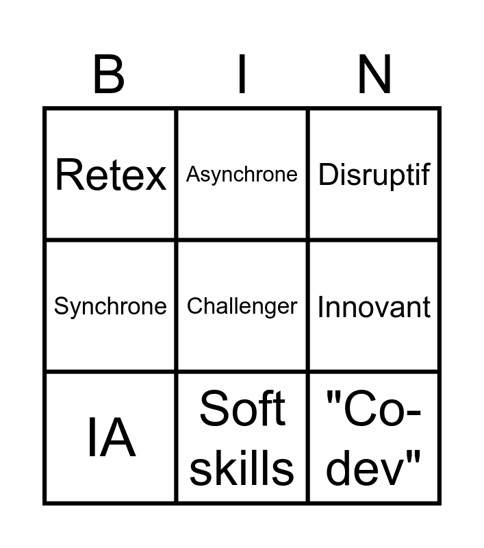 This bingo card has 9 words: IA, Disruptif, Asynchrone, Synchrone, Retex, Innovant, Challenger, "Co-dev" and Soft skills.