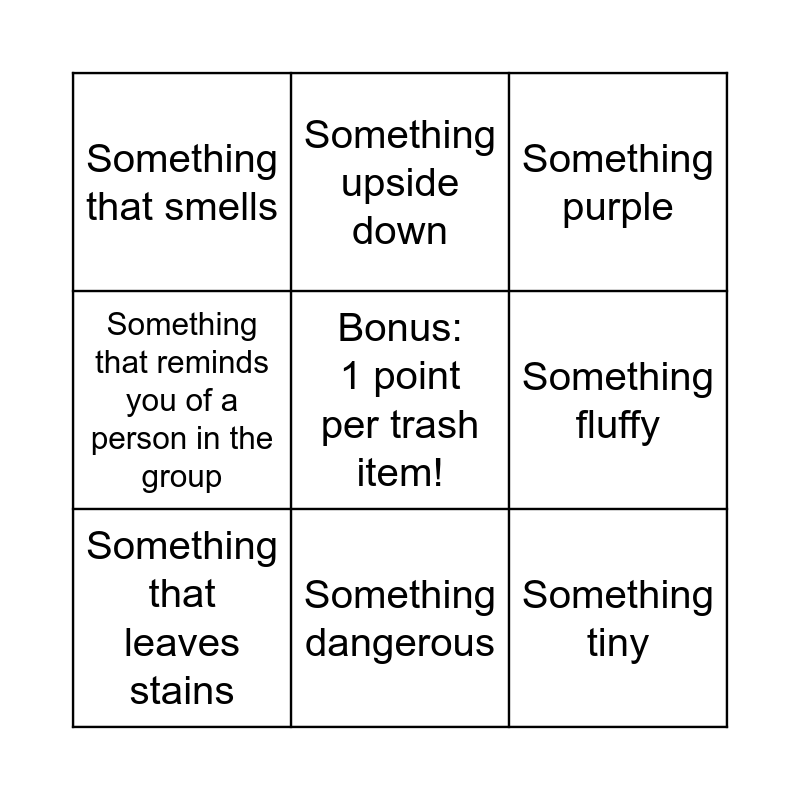 This bingo card has a free space and 8 words: Something fluffy, Something purple, Something upside down, Something that leaves stains, Something that smells, Something tiny, Something that reminds you of a person in the group and Something dangerous.