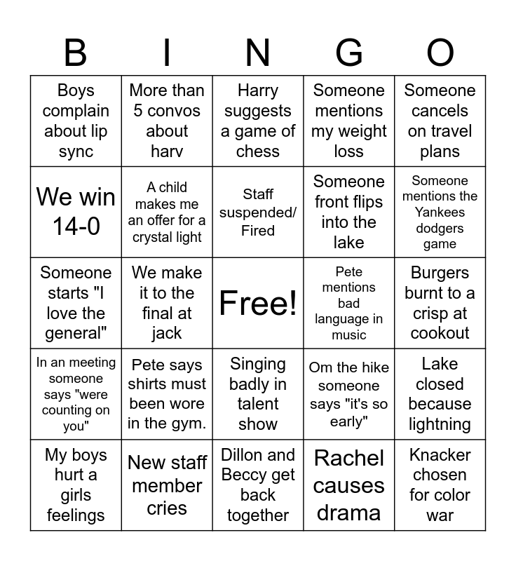 This bingo card has a free space and 24 words: Pete says shirts must been wore in the gym., New staff member cries, Staff suspended/ Fired, My boys hurt a girls feelings, Someone cancels on travel plans, Boys complain about lip sync, We win 14-0, More than 5 convos about harv, Pete mentions bad language in music, Singing badly in talent show, Someone front flips into the lake, Someone starts "I love the general", Om the hike someone says "it's so early", Lake closed because lightning, A child makes me an offer for a crystal light, Rachel causes drama, Burgers burnt to a crisp at cookout, Harry suggests a game of chess, Someone mentions the Yankees dodgers game, We make it to the final at jack, Knacker chosen for color war, In an meeting someone says "were counting on you", Someone mentions my weight loss and Dillon and Beccy get back together.