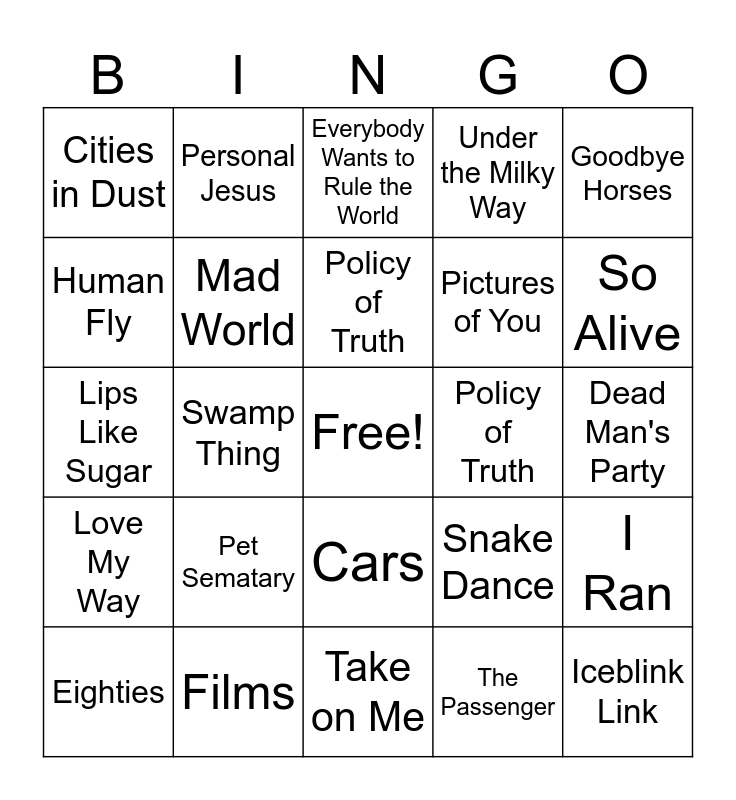 This bingo card has a free space and 66 words: The Promise, Enola Gay, Boy's Don't Cry, I Ran, Space Age Love Song, Metro, Personal Jesus, Never Let Me Down Again, Policy of Truth, I Melt with You, Cars, Blue Monday, Dead Man's Party, Goodbye Horses, Smalltown Boy, Human Fly, Swamp Thing, Cities in Dust, Revenge, Pictures of You, Pet Sematary, Love My Way, Under the Milky Way, Bela Lugosi's Dead, Fascination Street, Dominion/Mother Russia, Effigy, Love Like Blood, Iceblink Link, Love Will Tear Us Apart, Eighties, Cars, Promise, Promises, Bizarre Love Triangle, Snake Dance, Films, Making Plans For Nigel, Lips Like Sugar, The Passenger, How Soon Is Now?, Mad World, Kiss Them for Me, Policy of Truth, Age of Consent, Girls on Film, People are People, So Alive, Cuts You Up, Dear Prudence, Private Idaho, Rock Lobster, Damaged Goods, Message in a Bottle, Whip It, Pump it Up, The Safety Dance, Whisper to a Scream, West End Girls, Everybody Wants to Rule the World, Take on Me, It's a Sin, Mexican Radio, Everybody Have Fun Tonight, Fascination, In a Big Country and Turning Japanese.