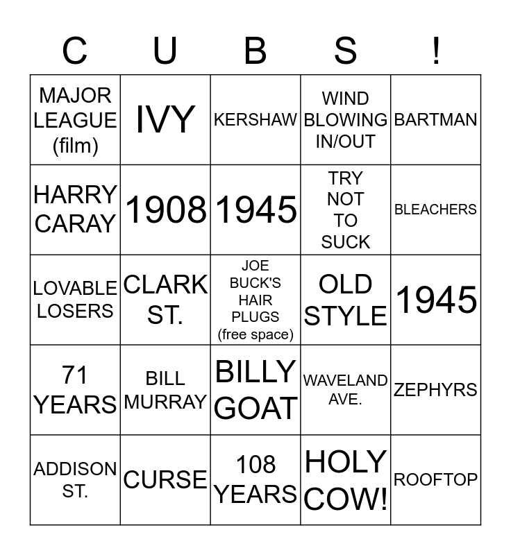 This bingo card has a free space and 24 words: BILL MURRAY, CURSE, 1945, ADDISON ST., BARTMAN, MAJOR LEAGUE (film), HARRY CARAY, IVY, OLD STYLE, BILLY GOAT, TRY NOT TO SUCK, LOVABLE LOSERS, WAVELAND AVE., ZEPHYRS, 1908, HOLY COW!, 1945, KERSHAW, BLEACHERS, CLARK ST., ROOFTOP, 71 YEARS, WIND BLOWING IN/OUT and 108 YEARS.
