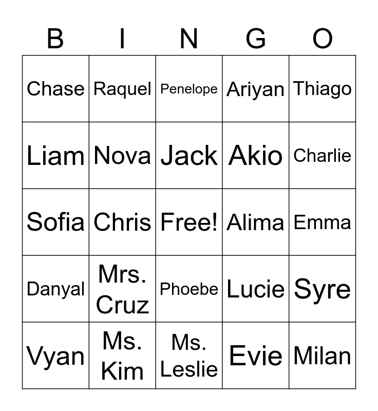 This bingo card has a free space and 24 words: Mrs. Cruz, Ms. Kim, Jack, Vyan, Thiago, Chase, Liam, Raquel, Alima, Phoebe, Akio, Sofia, Lucie, Syre, Nova, Evie, Emma, Penelope, Charlie, Chris, Milan, Danyal, Ariyan and Ms. Leslie.