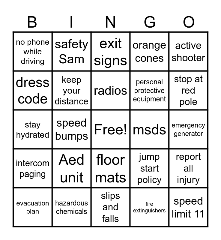 This bingo card has a free space and 40 words: heat stress, stay hydrated, ladder safety, keep your distance, hazardous chemicals, floor mats, radios, shelter in place, active shooter, intercom paging, speed bumps, orange cones, speed limit 11, emergency generator, msds, Aed unit, housekeeping, no phone while driving, eye protection, exit signs, report all injury, fire extinguishers, personal protective equipment, dress code, safety vest, seat belts, report all accidents, yellow stripes, rubber gloves, 90 degree rule, safety gas cans, evacuation plan, 911, jump start policy, stop at red pole, slips and falls, hurricane procedures, eye wash station, safety Sam and unsafe cars.