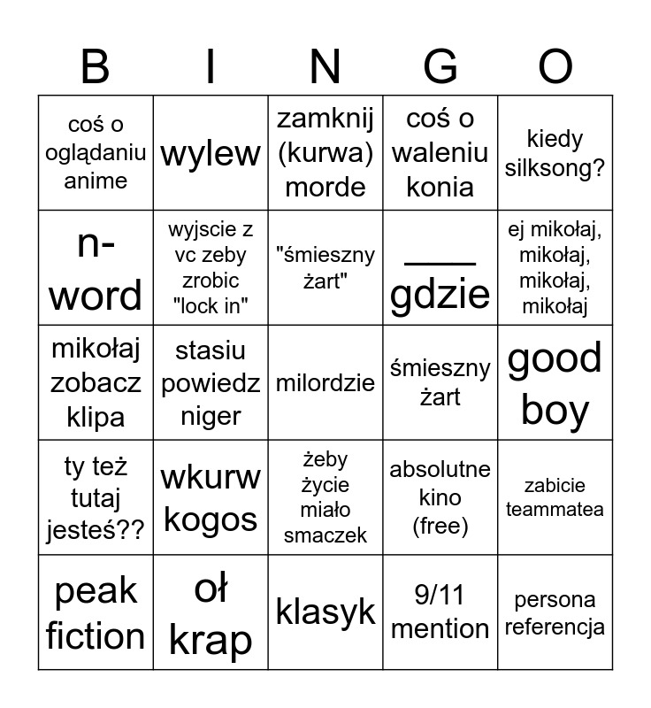 This bingo card has 25 words: wkurw kogos, klasyk, "śmieszny żart", peak fiction, kiedy silksong?, coś o oglądaniu anime, n-word, wylew, śmieszny żart, żeby życie miało smaczek, ___ gdzie, mikołaj zobacz klipa, absolutne kino (free), zabicie teammatea, wyjscie z vc zeby zrobic "lock in", persona referencja, good boy, zamknij (kurwa) morde, ej mikołaj, mikołaj, mikołaj, mikołaj, stasiu powiedz niger, milordzie, oł krap, ty też tutaj jesteś??, coś o waleniu konia and 9/11 mention.