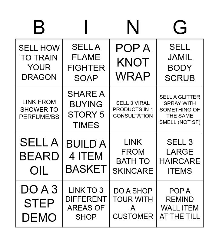 This bingo card has 16 words: LINK TO 3 DIFFERENT AREAS OF SHOP, SELL 3 LARGE HAIRCARE ITEMS, POP A KNOT WRAP, SELL HOW TO TRAIN YOUR DRAGON, SELL A BEARD OIL, SELL A FLAME FIGHTER SOAP, LINK FROM BATH TO SKINCARE, DO A SHOP TOUR WITH A CUSTOMER, LINK FROM SHOWER TO PERFUME/BS, SHARE A BUYING STORY 5 TIMES, DO A 3 STEP DEMO, SELL JAMIL BODY SCRUB, BUILD A 4 ITEM BASKET, SELL A GLITTER SPRAY WITH SOMETHING OF THE SAME SMELL (NOT SF), SELL 3 VIRAL PRODUCTS IN 1 CONSULTATION and POP A REMIND WALL ITEM AT THE TILL.