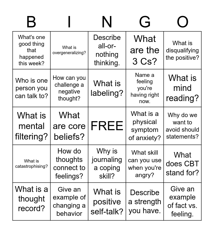 This bingo card has a free space and 24 words: How do thoughts connect to feelings?, Give an example of changing a behavior, What is labeling?, What is a thought record?, What is disqualifying the positive?, What's one good thing that happened this week?, Who is one person you can talk to?, What is overgeneralizing?, What is a physical symptom of anxiety?, Why is journaling a coping skill?, Name a feeling you're having right now., What is mental filtering?, What skill can you use when you're angry?, What does CBT stand for?, How can you challenge a negative thought?, Describe a strength you have., Why do we want to avoid should statements?, Describe all-or-nothing thinking., What is mind reading?, What are core beliefs?, Give an example of fact vs. feeling., What is catastrophising?, What are the 3 Cs? and What is positive self-talk?.