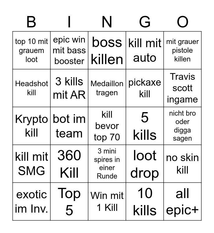 This bingo card has a free space and 24 words: 360 Kill, Top 5, Medaillon tragen, exotic im Inv., mit grauer pistole killen, top 10 mit grauem loot, Headshot kill, epic win mit bass booster, 5 kills, 3 mini spires in einer Runde, pickaxe kill, Krypto kill, loot drop, no skin kill, 3 kills mit AR, 10 kills, nicht bro oder digga sagen, boss killen, Travis scott ingame, bot im team, all epic+, kill mit SMG, kill mit auto and Win mit 1 Kill.