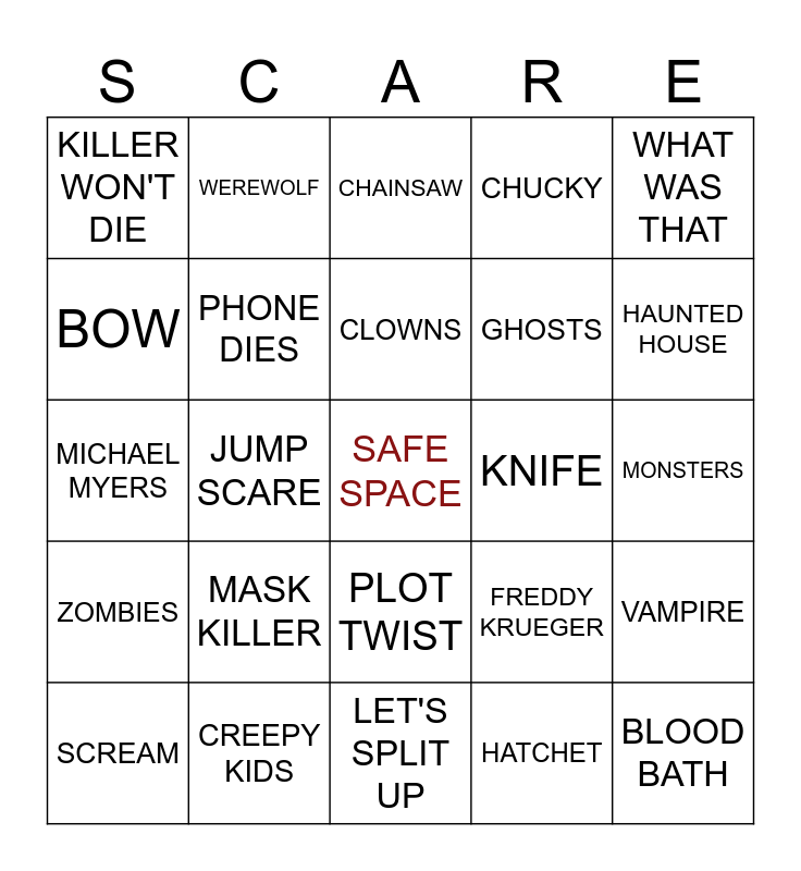 This bingo card has a free space and 24 words: MASK KILLER, CREEPY KIDS, CLOWNS, SCREAM, WHAT WAS THAT, KILLER WON'T DIE, BOW, WEREWOLF, KNIFE, PLOT TWIST, GHOSTS, MICHAEL MYERS, FREDDY KRUEGER, VAMPIRE, PHONE DIES, HATCHET, MONSTERS, CHAINSAW, HAUNTED HOUSE, JUMP SCARE, BLOOD BATH, ZOMBIES, CHUCKY and LET'S SPLIT UP.