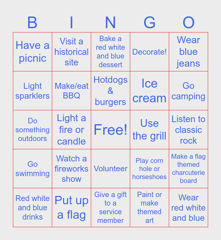 This bingo card has a free space and 24 words: Watch a fireworks show, Put up a flag, Hotdogs & burgers, Red white and blue drinks, Wear blue jeans, Have a picnic, Light sparklers, Visit a historical site, Use the grill, Volunteer, Ice cream, Do something outdoors, Play corn hole or horseshoes, Make a flag themed charcuterie board, Make/eat BBQ, Paint or make themed art, Listen to classic rock, Bake a red white and blue dessert, Go camping, Light a fire or candle, Wear red white and blue, Go swimming, Decorate! and Give a gift to a service member.