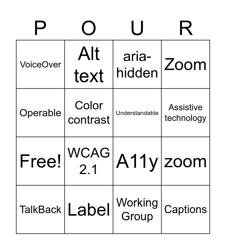 This bingo card has 20 words: zoom, button vs link, aria-hidden, JAWS, TalkBack, Operable, Label, VoiceOver, Free!, Alt text, WCAG 2.1, A11y, Color contrast, Captions, Understandable, Heading order, Assistive technology, Zoom, Working Group and Mouse.