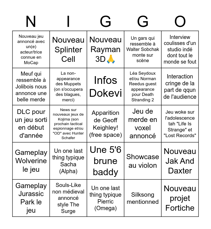 This bingo card has a free space and 24 words: Un one last thing typique Sacha (Alpha), Souls-Like non médieval annoncé style The Surge, Infos Dokevi, Gameplay Jurassic Park le jeu, Interview coulisses d'un studio indé dont tout le monde se fout, Nouveau jeu annoncé avec un(e) acteur/trice connue en MoCap, Meuf qui ressemble à Jolibois nous annonce une belle merde, Nouveau Splinter Cell, Jeu de merde en voxel annoncé, Une 5'6 brune baddy, Léa Seydoux et/ou Norman Reedus guest appearance pour Death Stranding 2, DLC pour un jeu sorti en début d'année, Showcase au violon, Nouveau Jak And Daxter, La non-appearance des Muppets (on s'occupera des blagues, merci), Silksong mentionned, Jeu woke sur l'adolescence tah "Life Is Strange" et "Lost Records", Nouveau Rayman 3D🙏, Interaction cringe de la part de qqun de l'audience, News sur nouveaux jeux de Kojima (son prochain tactical espionnage et/ou "OD" avec Hunter Schafer, Nouveau projet Fortiche, Gameplay Wolverine le jeu, Un gars qui ressemble à Walter Sobchak monte sur scène and Un one last thing typique Pierric (Omega).