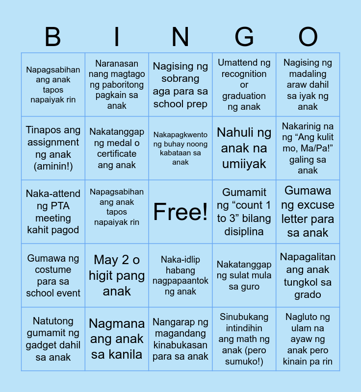 This bingo card has a free space and 24 words: May 2 o higit pang anak, Nagmana ang anak sa kanila, Nakapagkwento ng buhay noong kabataan sa anak, Natutong gumamit ng gadget dahil sa anak, Nagising ng madaling araw dahil sa iyak ng anak, Napagsabihan ang anak tapos napaiyak rin, Tinapos ang assignment ng anak (aminin!), Naranasan nang magtago ng paboritong pagkain sa anak, Gumamit ng “count 1 to 3” bilang disiplina, Naka-idlip habang nagpapaantok ng anak, Nahuli ng anak na umiiyak, Naka-attend ng PTA meeting kahit pagod, Nakatanggap ng sulat mula sa guro, Napagalitan ang anak tungkol sa grado, Nakatanggap ng medal o certificate ang anak, Sinubukang intindihin ang math ng anak (pero sumuko!), Gumawa ng excuse letter para sa anak, Nagising ng sobrang aga para sa school prep, Nakarinig na ng “Ang kulit mo, Ma/Pa!” galing sa anak, Napagsabihan ang anak tapos napaiyak rin, Nagluto ng ulam na ayaw ng anak pero kinain pa rin, Gumawa ng costume para sa school event, Umattend ng recognition or graduation ng anak and Nangarap ng magandang kinabukasan para sa anak.
