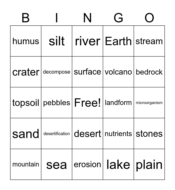 This bingo card has a free space and 43 words: valley, plain, terrain, mountain, hill, lake, river, land, stream, sea, Earth, landform, desert, desertification, soil, erosion, weathering, topsoil, subsoil, bedrock, silt, clay, loam, humus, bacteria, microorganism, water, air, nutrients, sand, plants, stones, rocks, pebbles, rain, drainage, topography, surface, crater, volcano, compost, decompose and material.