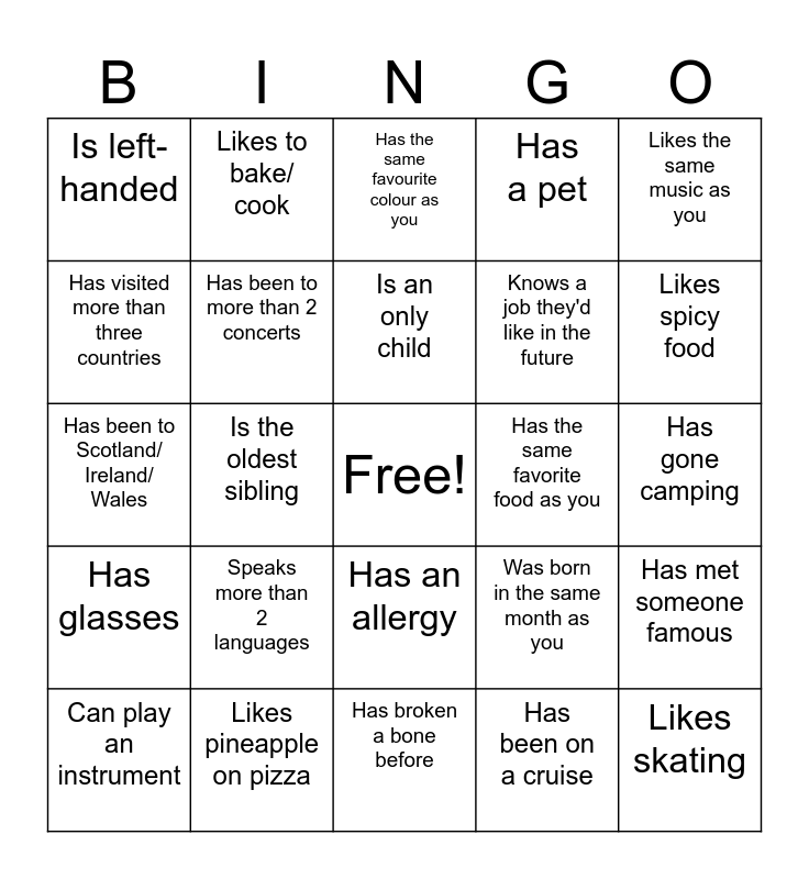 This bingo card has a free space and 24 words: Speaks more than 2 languages, Likes pineapple on pizza, Is an only child, Can play an instrument, Likes the same music as you, Is left-handed, Has visited more than three countries, Likes to bake/ cook, Has the same favorite food as you, Has an allergy, Knows a job they'd like in the future, Has been to Scotland/ Ireland/ Wales, Was born in the same month as you, Has met someone famous, Has been to more than 2 concerts, Has been on a cruise, Has gone camping, Has the same favourite colour as you, Likes spicy food, Is the oldest sibling, Likes skating, Has glasses, Has a pet and Has broken a bone before.