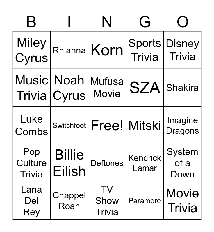 This bingo card has a free space and 24 words: Billie Eilish, Chappel Roan, Mufusa Movie, Lana Del Rey, Disney Trivia, Miley Cyrus, Music Trivia, Rhianna, Mitski, Deftones, SZA, Luke Combs, Kendrick Lamar, System of a Down, Noah Cyrus, Paramore, Imagine Dragons, Korn, Shakira, Switchfoot, Movie Trivia, Pop Culture Trivia, Sports Trivia and TV Show Trivia.