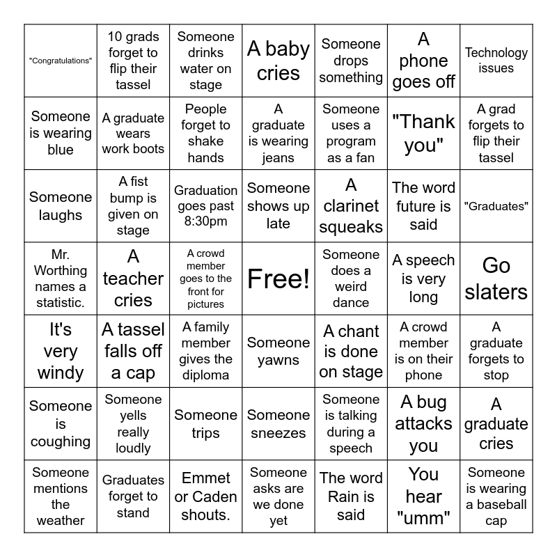 This bingo card has a free space and 55 words: The word Rain is said, "Graduates", "Luck", "Congratulations", A teacher cries, Someone yells really loudly, Technology issues, A graduate wears heels., A graduate wears work boots, Someone trips, A baby cries, A graduate forgets to stop, Go slaters, A speech is very long, Someone mentions the weather, It's very windy, Someone drops something, Someone uses a program as a fan, You hear "umm", "Thank you", A grad forgets to flip their tassel, A tassel falls off a cap, A clarinet squeaks, Someone drinks water on stage, A grad falls asleep, Someone is wearing blue, A crowd member goes to the front for pictures, A bad joke is made, Someone laughs, The word future is said, 2025, A crowd member is on their phone, A graduate cries, Graduates forget to stand, A phone goes off, A graduate is wearing jeans, Someone is coughing, A fist bump is given on stage, Someone is wearing a baseball cap, A family member gives the diploma, 10 grads forget to flip their tassel, Someone sneezes, Someone is talking during a speech, Your music blows off the stand, Graduation goes past 8:30pm, Mr. Worthing names a statistic., Emmet or Caden shouts., A chant is done on stage, Someone does a weird dance, People forget to shake hands, Someone yawns, A bug attacks you, Someone asks are we done yet, Someone shows up late and A graduate is frowning.
