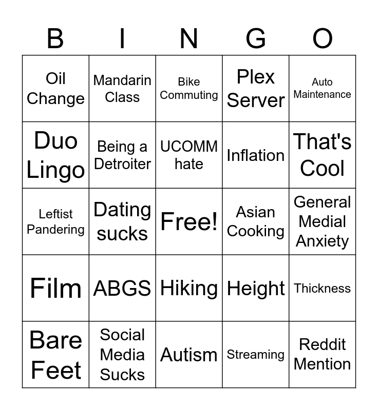 This bingo card has a free space and 25 words: ABGS, Autism, UCOMM hate, Bare Feet, Auto Maintenance, Oil Change, Duo Lingo, Mandarin Class, Asian Cooking, Hiking, Inflation, Leftist Pandering, Height, Thickness, Being a Detroiter, Self Help Book, General Medial Anxiety, Bike Commuting, That's Cool, Dating sucks, Reddit Mention, Social Media Sucks, Film, Plex Server and Streaming.