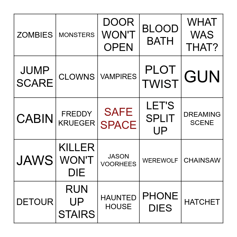 This bingo card has a free space and 48 words: MASK KILLER, HATCHET, GHOSTS, HAUNTED HOUSE, KILLER WON'T DIE, CREEPY KIDS, MONSTERS, MICHAEL MYERS, JUMP SCARE, BOW, CLOWNS, BLOOD BATH, CHAINSAW, WEREWOLF, SCREAM, CHUCKY, VAMPIRES, LET'S SPLIT UP, KNIFE, WHAT WAS THAT?, FREDDY KRUEGER, PHONE DIES, ZOMBIES, PLOT TWIST, AX, GUN, DETOUR, CANDYMAN, JASON VOORHEES, JAWS, CARRIER, RED BALLOON, CAR WON'T START, DON'T MOVE, RUN UP STAIRS, POWER GOES OUT, MAKE OUT SCENE, DREAMING SCENE, SCARY WOODS, SUSPICIOUS PERSON, SPOOKY MUSIC, CEMETERY, DOOR WON'T OPEN, HELP! HELP!, CABIN, OUIJA BOARD, CHASE SCENE and LOUD BANG.