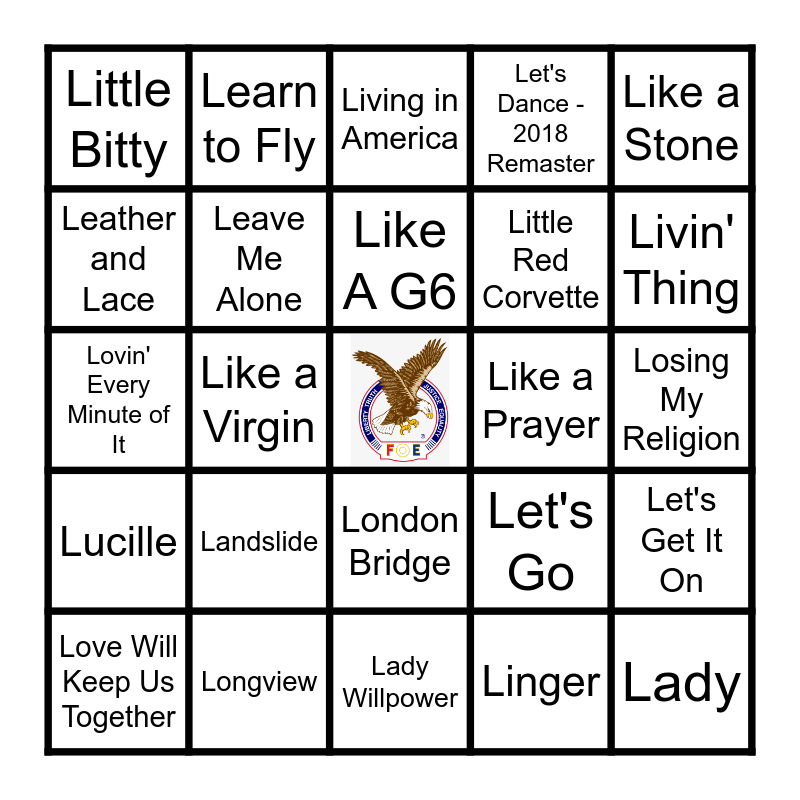 This bingo card has a free space and 50 words: La Bamba, Lady, Lady Marmalade - Single Edit, Lady Willpower, Landslide, Layla, Learn to Fly, Learning To Fly, Leather and Lace, Leave a Light On (Talk Away The Dark), Leave Me Alone, Let's Dance - 2018 Remaster, Let's Get It On, Let's Go, Let's Go Crazy, Let's Hear It for the Boy - From Footloose Original Soundtrack, Like A G6, Like a Prayer, Like A Rock, Like a Stone, Like a Virgin, Linger, Little Bitty, Little Red Corvette, Livin' On A Prayer, Livin' On Love, Livin' Thing, Living Dead Girl, Living in America, London Bridge, Long Cool Woman (In a Black Dress) - 1999 Remaster, Long Haired Country Boy, Long Long Time, Long Train Runnin', Longview, Lookin' for Love, Lose Yourself, Loser, Losers (Feat. Jelly Roll), Losing My Religion, Love In An Elevator, Love Is A Battlefield, Love Shack, Love Somebody, Love Will Keep Us Together, Lovin' Every Minute of It, Lovin' Touchin' Squeezin', Lovin' You's a Dirty Job, Lucille and Luckenbach Texas (Back to the Basics of Love) (feat. Willie Nelson).