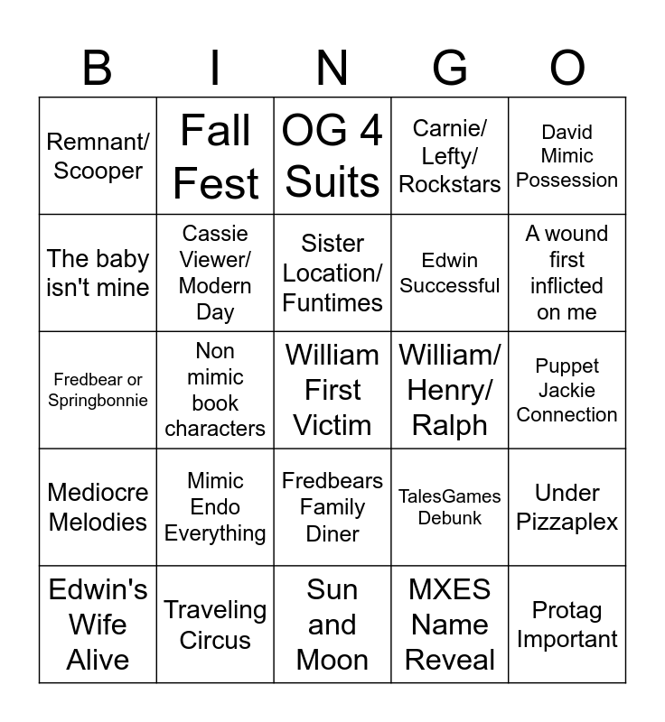 This bingo card has 25 words: Mimic Endo Everything, Sun and Moon, Sister Location/ Funtimes, Edwin's Wife Alive, David Mimic Possession, Remnant/ Scooper, The baby isn't mine, Fall Fest, William/ Henry/ Ralph, Fredbears Family Diner, Edwin Successful, Fredbear or Springbonnie, TalesGames Debunk, Under Pizzaplex, Cassie Viewer/ Modern Day, Protag Important, Puppet Jackie Connection, OG 4 Suits, A wound first inflicted on me, Non mimic book characters, William First Victim, Traveling Circus, Mediocre Melodies, Carnie/ Lefty/ Rockstars and MXES Name Reveal.