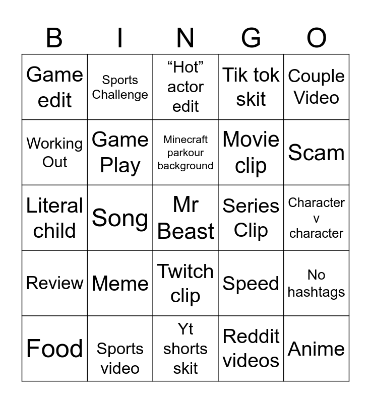 This bingo card has a free space and 24 words: Meme, Sports video, Minecraft parkour background, Food, Couple Video, Game edit, Working Out, Sports Challenge, Series Clip, Twitch clip, Movie clip, Literal child, Speed, No hashtags, Game Play, Reddit videos, Character v character, “Hot” actor edit, Scam, Song, Anime, Review, Tik tok skit and Yt shorts skit.
