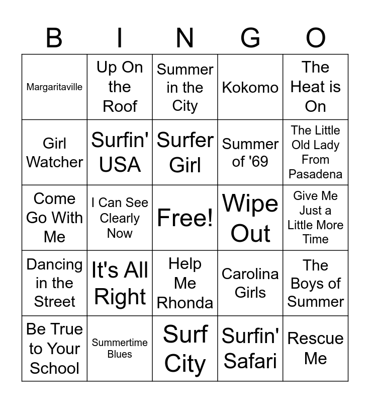 This bingo card has a free space and 55 words: Walking On Sunshine, In the Summertime, Summer Nights, Kokomo, The Boys of Summer, Summer Breeze, Surfin' USA, Under the Boardwalk, Summer of '69, Heat Wave, Margaritaville, Good Vibrations, Here Comes the Sun, Saturday in the Park, California Girls, Beyond the Sea, Summer in the City, Wipe Out, Good Day Sunshine, Dancing in the Street, Summertime Blues, Surf City, Surfin' Safari, The Heat is On, One Summer Night, I Can See Clearly Now, Surfer Girl, Vacation, The Little Old Lady From Pasadena, I Get Around, Dead Man's Curve, Help Me Rhonda, Little Deuce Coop, Fun, Fun, Fun, Girl Watcher, It's All Right, Be Young, Be Foolish, Be Happy, Carolina Girls, Rescue Me, I Love Beach Music, Up On the Roof, You Are My Sunshine, Don't Worry Baby, Shut Down, Be True to Your School, When I Grow Up to be a Man, In My Room, God Only Knows, Wouldn't It Be Nice, Come Go With Me, Barbara Ann, Do You Wanna Dance?, Big Girls Don't Cry, Give Me Just a Little More Time and Up on the Roof.
