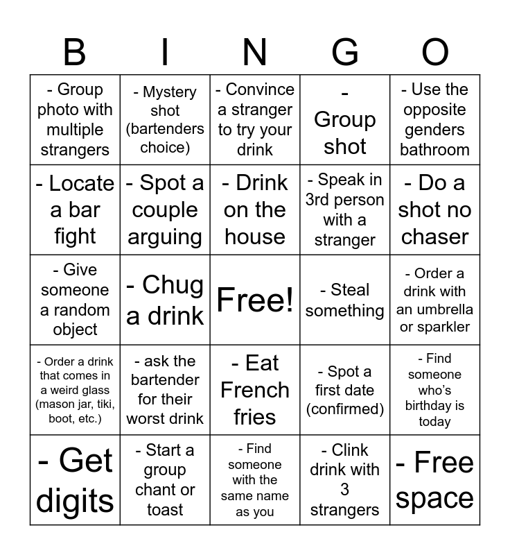 This bingo card has a free space and 25 words: - ask the bartender for their worst drink, - Find someone with the same name as you, - Drink on the house, - Get digits, - Use the opposite genders bathroom, - Group photo with multiple strangers, - Locate a bar fight, - Mystery shot (bartenders choice), - Steal something, - Eat French fries, - Speak in 3rd person with a stranger, - Give someone a random object, - Spot a first date (confirmed), - Find someone who’s birthday is today, - Spot a couple arguing, - Spot someone asleep at the bar, - Order a drink with an umbrella or sparkler, - Convince a stranger to try your drink, - Do a shot no chaser, - Chug a drink, - Free space, - Start a group chant or toast, - Order a drink that comes in a weird glass (mason jar, tiki, boot, etc.), - Group shot and - Clink drink with 3 strangers.