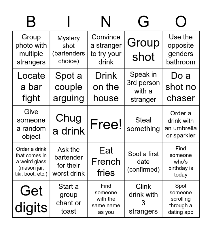 This bingo card has a free space and 25 words: Ask the bartender for their worst drink, Find someone with the same name as you, Drink on the house, Get digits, Use the opposite genders bathroom, Group photo with multiple strangers, Locate a bar fight, Mystery shot (bartenders choice), Steal something, Eat French fries, Speak in 3rd person with a stranger, Give someone a random object, Spot a first date (confirmed), Find someone who’s birthday is today, Spot a couple arguing, Spot someone asleep at the bar, Order a drink with an umbrella or sparkler, Convince a stranger to try your drink, Do a shot no chaser, Chug a drink, Spot someone scrolling through a dating app, Start a group chant or toast, Order a drink that comes in a weird glass (mason jar, tiki, boot, etc.), Group shot and Clink drink with 3 strangers.