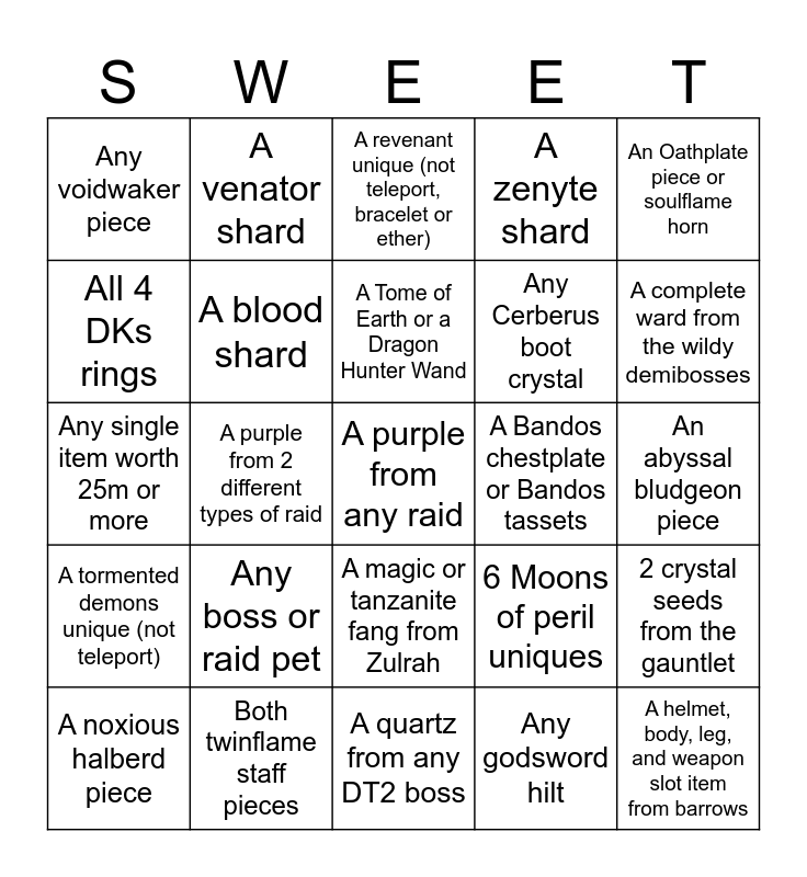 This bingo card has a free space and 24 words: Any boss or raid pet, Both twinflame staff pieces, A Tome of Earth or a Dragon Hunter Wand, A noxious halberd piece, An Oathplate piece or soulflame horn, Any voidwaker piece, All 4 DKs rings, A venator shard, A Bandos chestplate or Bandos tassets, A magic or tanzanite fang from Zulrah, Any Cerberus boot crystal, Any single item worth 25m or more, 6 Moons of peril uniques, 2 crystal seeds from the gauntlet, A blood shard, Any godsword hilt, An abyssal bludgeon piece, A revenant unique (not teleport, bracelet or ether), A complete ward from the wildy demibosses, A purple from 2 different types of raid, A helmet, body, leg, and weapon slot item from barrows, A tormented demons unique (not teleport), A zenyte shard and A quartz from any DT2 boss.