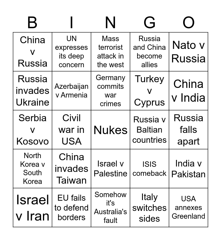 This bingo card has a free space and 24 words: China invades Taiwan, EU fails to defend borders, Germany commits war crimes, Israel v Iran, Nato v Russia, China v Russia, Russia invades Ukraine, UN expresses its deep concern, Russia v Baltian countries, Israel v Palestine, Turkey v Cyprus, Serbia v Kosovo, ISIS comeback, India v Pakistan, Azerbaijan v Armenia, Italy switches sides, Russia falls apart, Mass terrorist attack in the west, China v India, Civil war in USA, USA annexes Greenland, North Korea v South Korea, Russia and China become allies and Somehow it's Australia's fault.