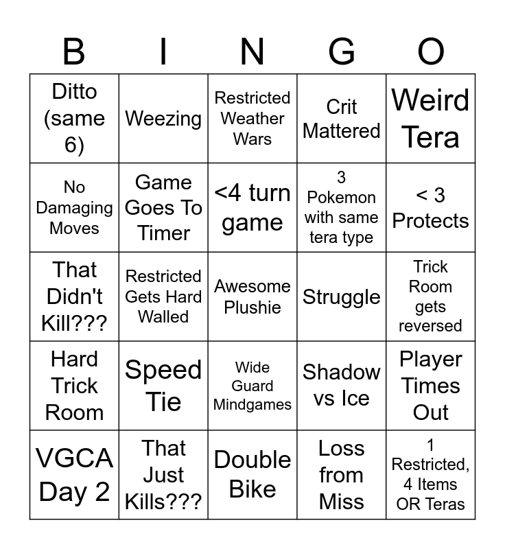 This bingo card has a free space and 34 words: Invisible Focus Sash, Loss from Miss, Absurd Luck, Actual Read, Hard Trick Room, Game Goes To Timer, Weird Tera, VGCA Day 2, Weezing, World Champion on stream, <4 turn game, Restricted Weather Wars, All Shinies, Useless Restricted, Struggle, < 3 Protects, That Just Kills???, That Didn't Kill???, Speed Tie, Shadow vs Ice, Wide Guard Mindgames, Ditto (Pokemon), Ditto (same 6), Trick Room gets reversed, Double Bike, 1 Restricted, 4 Items OR Teras, Crit Mattered, Salt-in-the-wound Luck, 3 Pokemon with same tera type, No Damaging Moves, Drop 10% Usage Between Days, Restricted Gets Hard Walled, Player Times Out and Player Hard Throws.