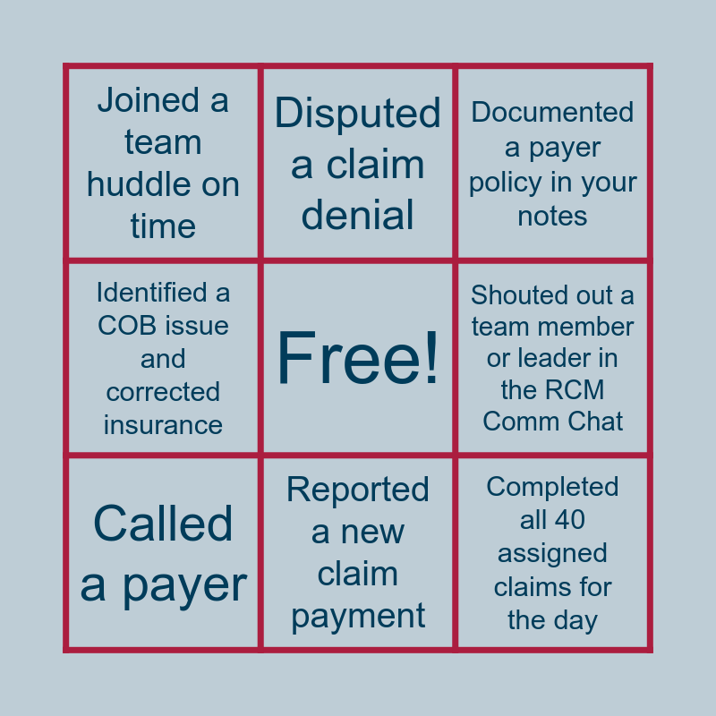This bingo card has a free space and 8 words: Shouted out a team member or leader in the RCM Comm Chat, Documented a payer policy in your notes, Disputed a claim denial, Called a payer, Joined a team huddle on time, Completed all 40 assigned claims for the day, Identified a COB issue and corrected insurance and Reported a new claim payment.