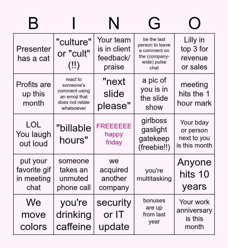 This bingo card has a free space and 42 words: Presenter has a dog, "next slide please", Microsoft Minute video is buffering, someone takes an unmuted phone call, bonuses are up from last year, Anyone hits 10 years, Your work anniversary is this month, A baby was born/marriage happened, Your team is in client feedback/ praise, we acquired another company, Your bday or person next to you is this month, meeting hits the 1 hour mark, "billable hours", Lilly in top 3 for revenue or sales, "impact", you're multitasking, audio or visual problems, LOL You laugh out loud, You haven't met the presenter, "culture" or "cult" (!!), Profits are up this month, You're in office (virtual region counts!), AI mentioned, Presenter has a cat, bonus is below 50%, "high performance" or variation, a pic of you is in the slide show, ESOP mentioned, New person hired in your region, "tremendous", post a comment that gets 10+ reacts in meeting chat, put your favorite gif in meeting chat, react to someone's comment using an emoji that does not relate whatsoever, security or IT update, someone falsely claims bingo, We move colors, you're drinking caffeine, girlboss gaslight gatekeep (freebie!!), you moved studios!, "special" is said 3+ times, be the last person to leave a comment on the (company-wide) pulse chat and be the first person to comment on today's (company-wide) pulse chat.