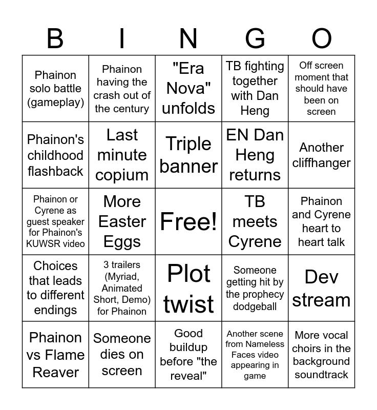 This bingo card has a free space and 24 words: Phainon vs Flame Reaver, 3 trailers (Myriad, Animated Short, Demo) for Phainon, Triple banner, Another scene from Nameless Faces video appearing in game, Off screen moment that should have been on screen, Phainon solo battle (gameplay), Phainon having the crash out of the century, "Era Nova" unfolds, TB meets Cyrene, Phainon and Cyrene heart to heart talk, Phainon or Cyrene as guest speaker for Phainon's KUWSR video, Last minute copium, Someone getting hit by the prophecy dodgeball, Dev stream, Phainon's childhood flashback, Someone dies on screen, Good buildup before "the reveal", TB fighting together with Dan Heng, Another cliffhanger, Choices that leads to different endings, More Easter Eggs, Plot twist, EN Dan Heng returns and More vocal choirs in the background soundtrack.