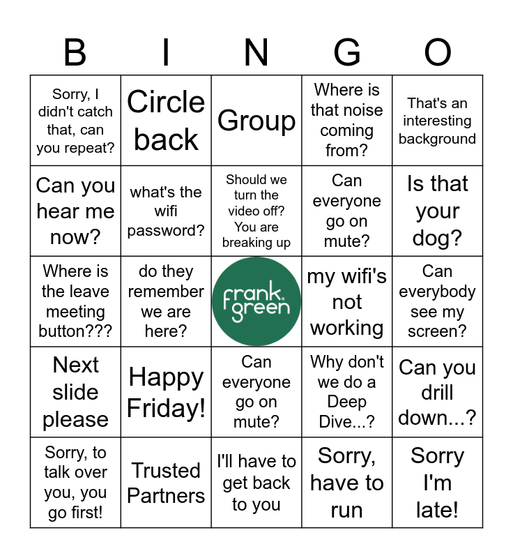 This bingo card has a free space and 39 words: Oops! I thought I was on mute!, Let's take it offline, Am I audible?, Why don't we do a Deep Dive...?, Can you drill down...?, Next slide please, do they remember we are here?, Not in my Wheelhouse, my wifi's not working, Can everybody see my screen?, Can you hear me now?, Circle back, Let me try my headphones, Is that your dog?, Where is the leave meeting button???, Happy Friday!, Can everyone go on mute?, Where is that noise coming from?, Heavy lifting, Sorry, to talk over you, you go first!, what's the wifi password?, Should we turn the video off? You are breaking up, Sorry, have to run, That's an interesting background, I think there is a lag, Trusted Partners, I'll have to get back to you, If you are talking, you're on mute!, Next Slide please, Sorry, I didn't catch that, can you repeat?, Can you email that to everyone?, Is that someone typing?, Can everyone go on mute?, Sorry I'm late!, I have a hard stop at..., Branch, Group, Stuff and You want what?.